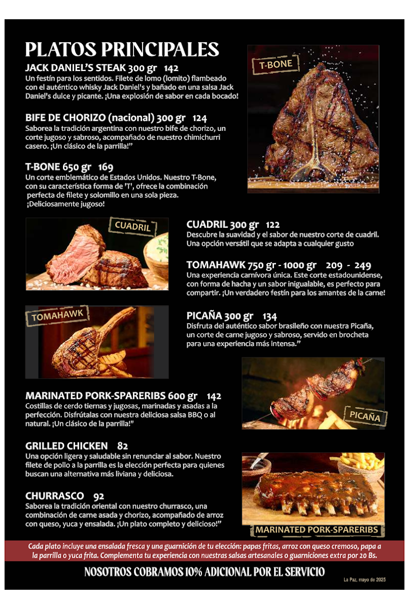 Located in the heart of La Paz at Murillo 1007, The Steakhouse offers a delightful culinary experience for steak enthusiasts. This establishment is known for its exceptional quality ingredients and meticulous preparation. The highlight of the menu is undoubtedly the Jack Daniel's steak, flambéed tableside, which captivates both diners' eyes and palates.